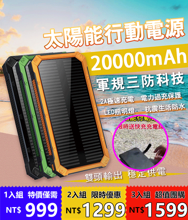 2分鐘前太陽能行動電源 - 【團購優惠】太陽能行動電源3入組僅需-NT$ 1599